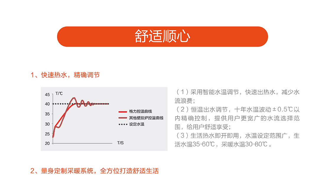 全預(yù)混燃燒結(jié)合雙寬域功率調(diào)節(jié),節(jié)能恒溫,溫差在±0.5℃之間,保證熱水四季恒溫快速出熱水,減少水流浪費,生活水溫度35-60℃,采暖水溫30-80℃